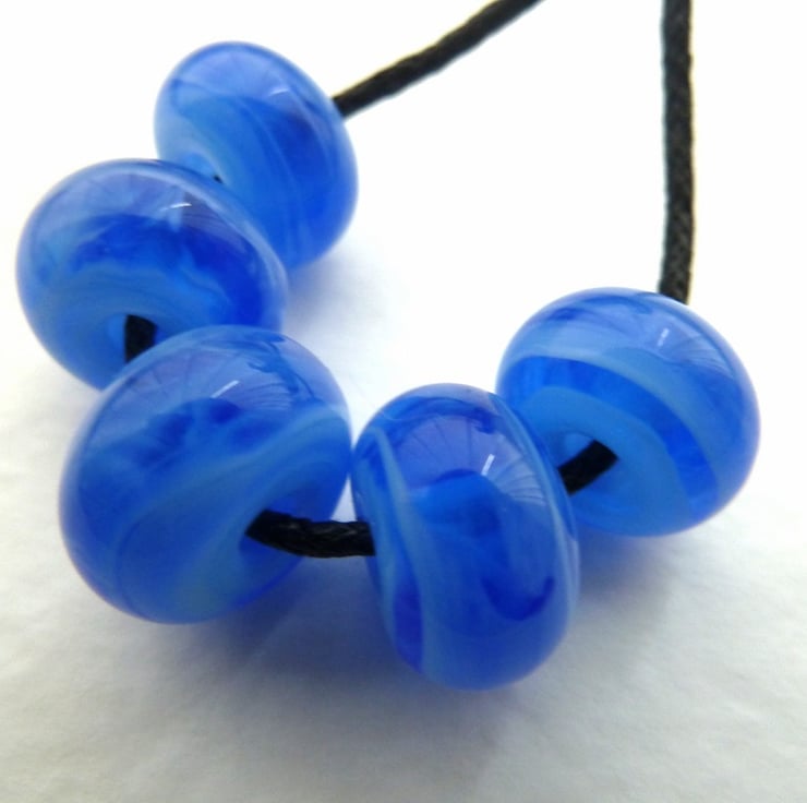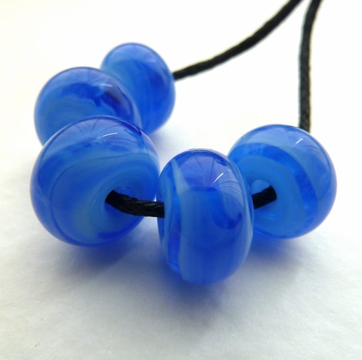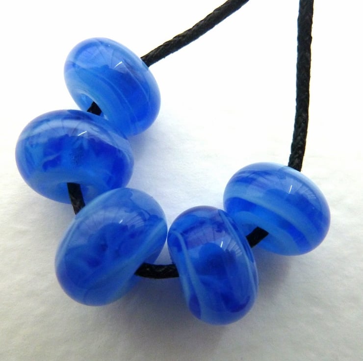 A set of 5 handmade lampwork glass beads which are blue with pale blue streaks.