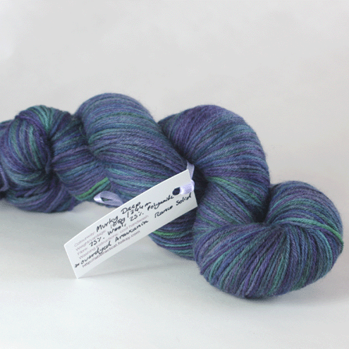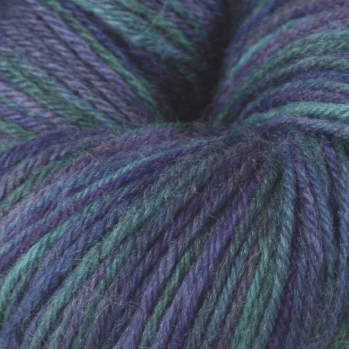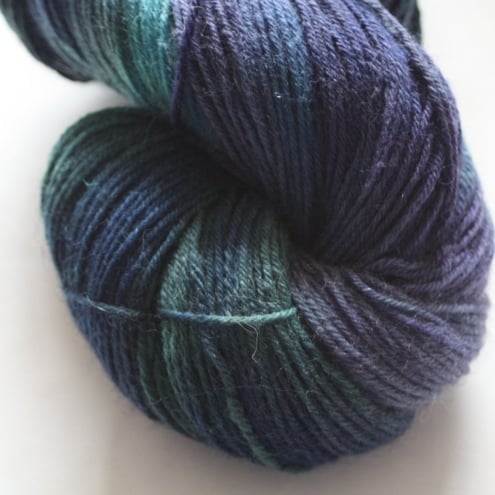 This skein is an overdyed skein of Araucania Ranco Solid and definitely a one-off. Like many of my other yarns, I've gone with a water theme. Muted blues, greens and purples with occasional emerald and turquoise flashes add a little lightness to this otherwise quite subtle yarn. This skein has been reskeined as shown in the first two photographs. The third photo shows the skein before reskeining, for reference only.