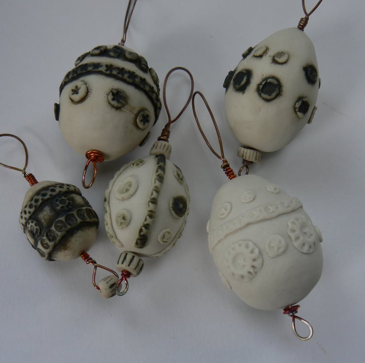 Handmade porcelain Easter egg. Hollow with applied decoration and a copper wire hanger. This one has two porcelain beads as well. This little delicate egg has been made using hand building techniques the applied decoration has been stamped to give pattern and texture. Once biscuit fired I have applied copper and manganese oxide to highlight the decoration and finally fired it to a stoneware temperature of 1240 C. The total length including wire is 9cm the egg and beads 5cm.