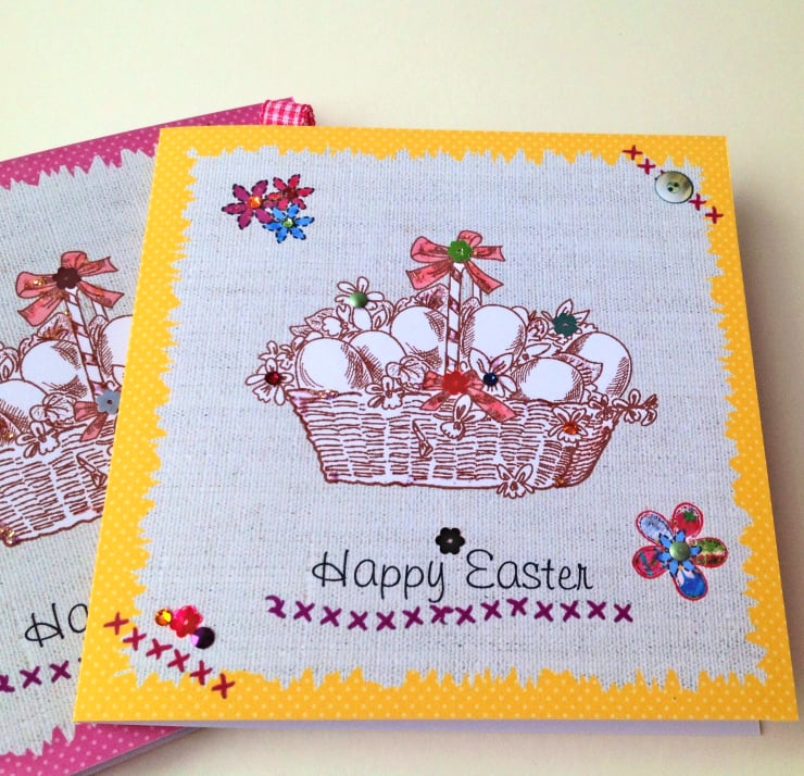 The printed background is a colourful pola dot print, with a printed linen effect second background, with a few stitches and button images.The main image is a vintage easter egg basket image.