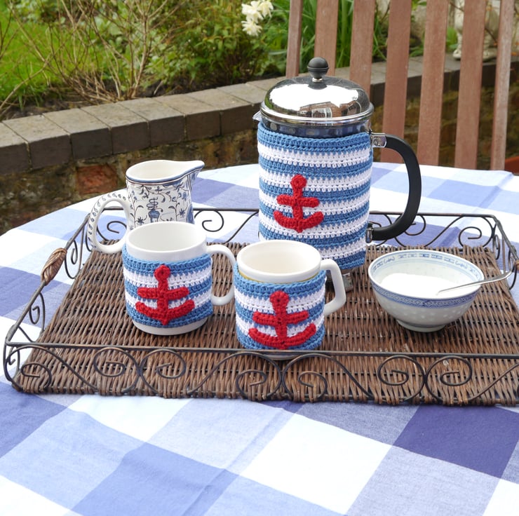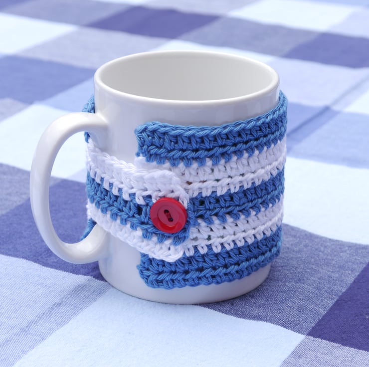 This blue and white striped nautical themed mug hug brings back lovely memories of holidays by the seaside. I have used good quality cotton to make this item and sewn on a red crocheted anchor using the same cotton. It measures 3in high and will fit a standard 3in diameter builders style mug.