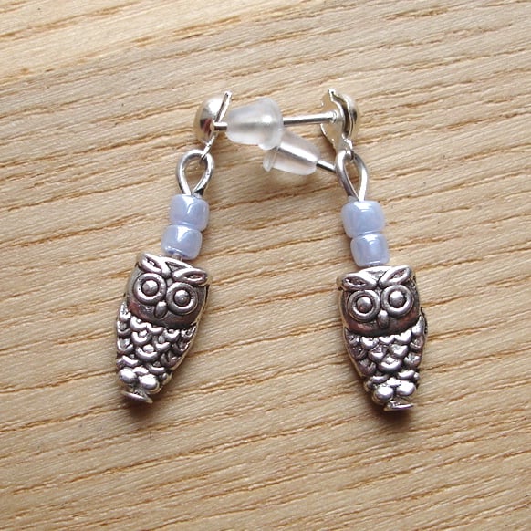These lovely earrings feature a pair of really unusual tibetan silver owl beads. They are accompanied by a couple of pastel blue glass seed beads and they hang on silver plated wires. Really dinky little earrings, perfect if you want something discrete but on trend. Light enough for regular wear, they make great daytime earrings.