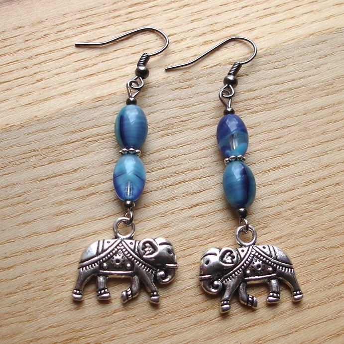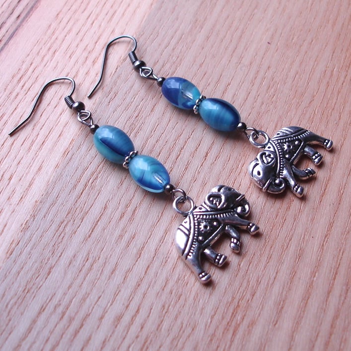 These cute tibetan elephant earrings feature some delightful charms which hang from black coloured findings and hooks. They are finished off with shiny blue glass and tibetan silver beads. Fabulously cute and very wearable!