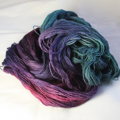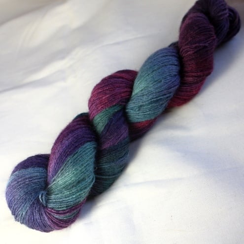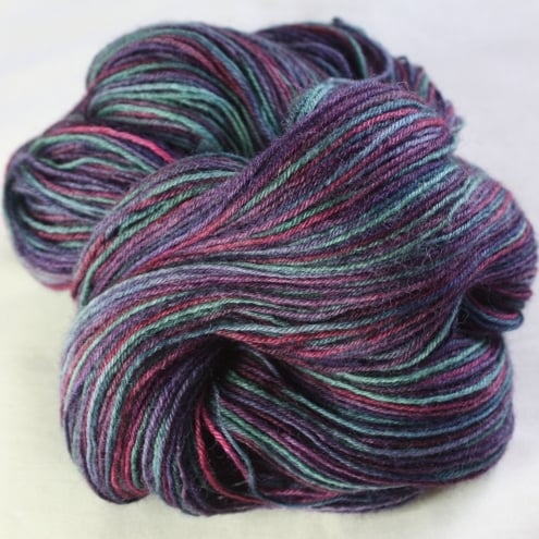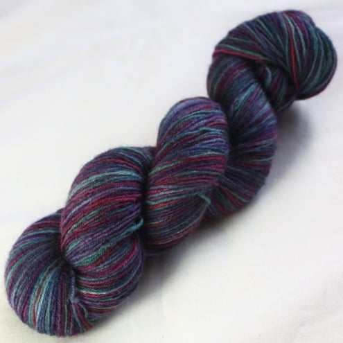 shades of green, purple, pink and navy, this is a lovely, soft and slightly lustrous sock-weight (4-ply) yarn. The yarn has