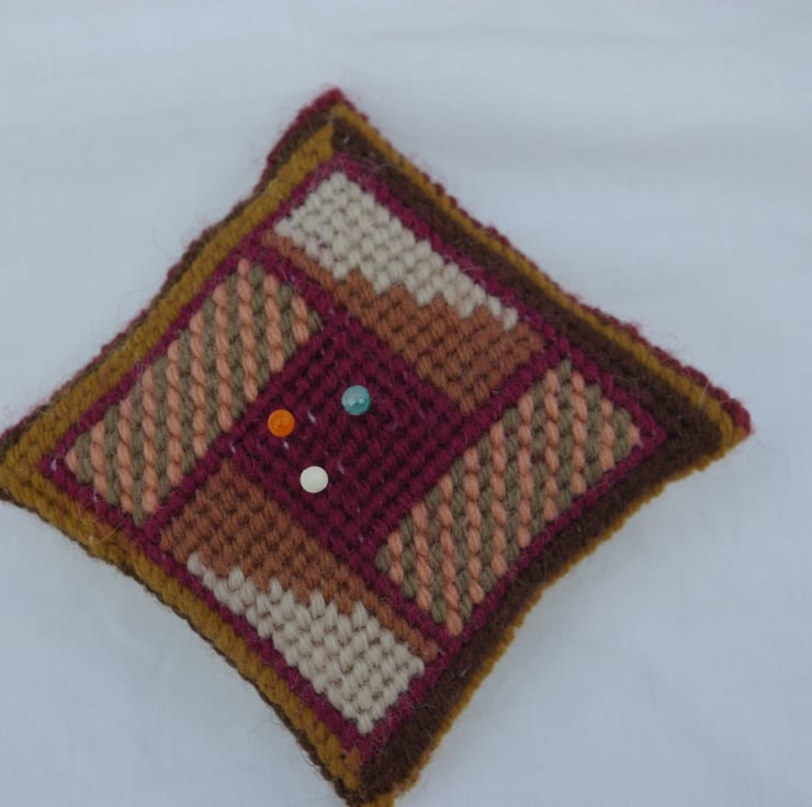 A symmetrical patterned Pin Cushion hand stitched in tapestry wools onto cotton tapestry canvas. In the centre of the Pin Cushion is a plain deep maroon coloured square. Then spinning out from the corners of the square, in brown, light gray and peach, are four panels of hand stitching. The design is finished with a border of brown stitching.