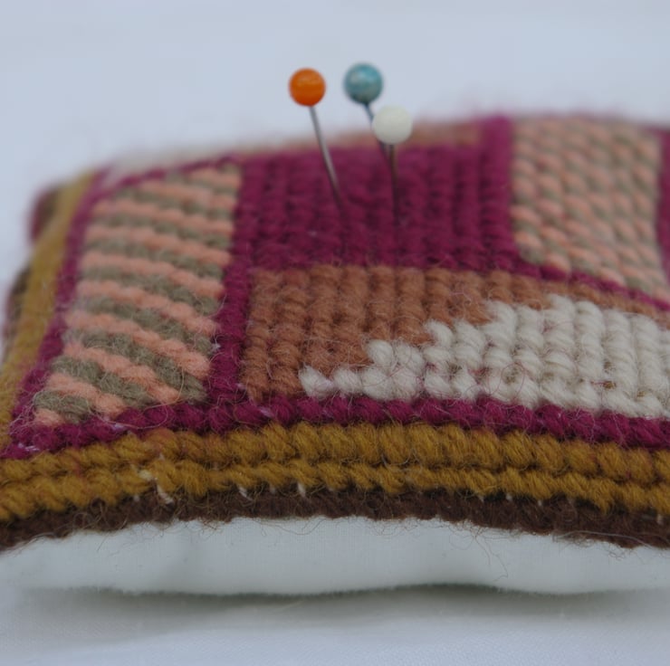 My love of patchwork inspired the design for this little Pin Cushion. Instead of using material for the different blocks I used tapestry yarn.