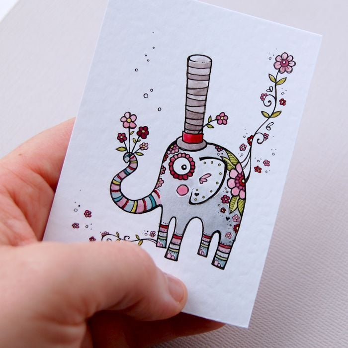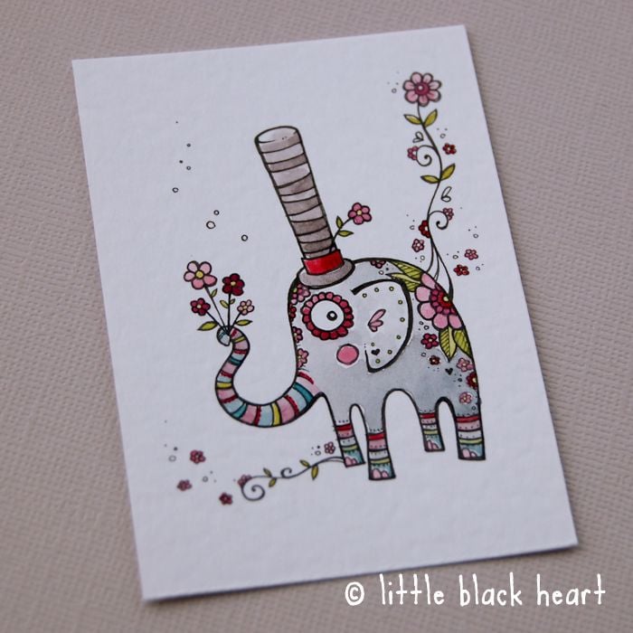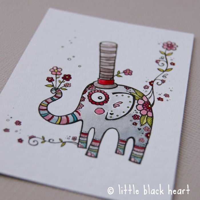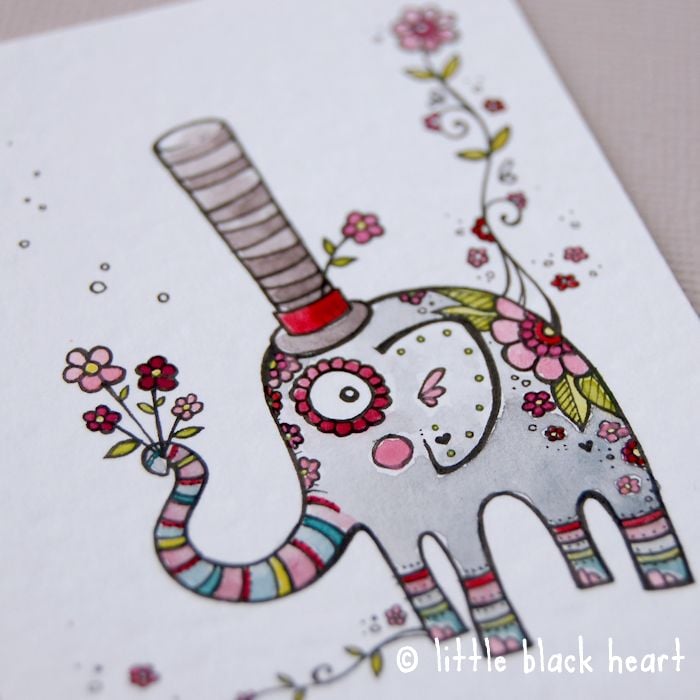 this little elephant is extra fancy! he features swirly bits, a stripey top hat, colourful trunk, and a pretty bum.