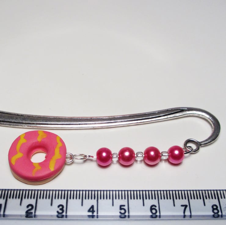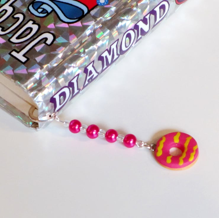 A very cute miniature hot pink iced ring biscuit charm on a bookmark, complete with pink coloured beads to give a "dangly" effect, to hang on the outside of your book.