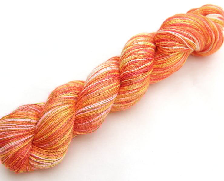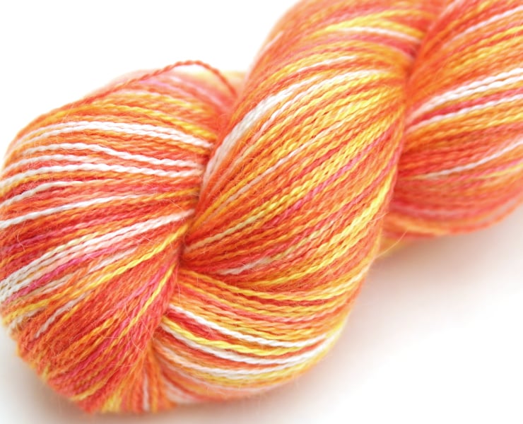 Soft oranges with lemon yellow, creamy white (undyed) and hits of pink. This gorgeous and luxurious yarn has the softness and warmth of alpaca with the smooth sheen and cool feel of silk. It should make beautiful lace projects. Photos taken and edited in bright natural light.