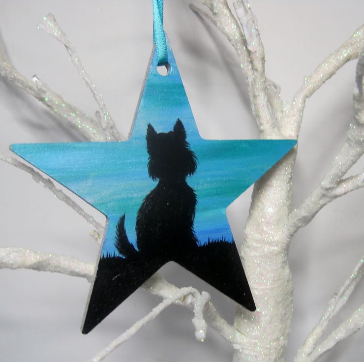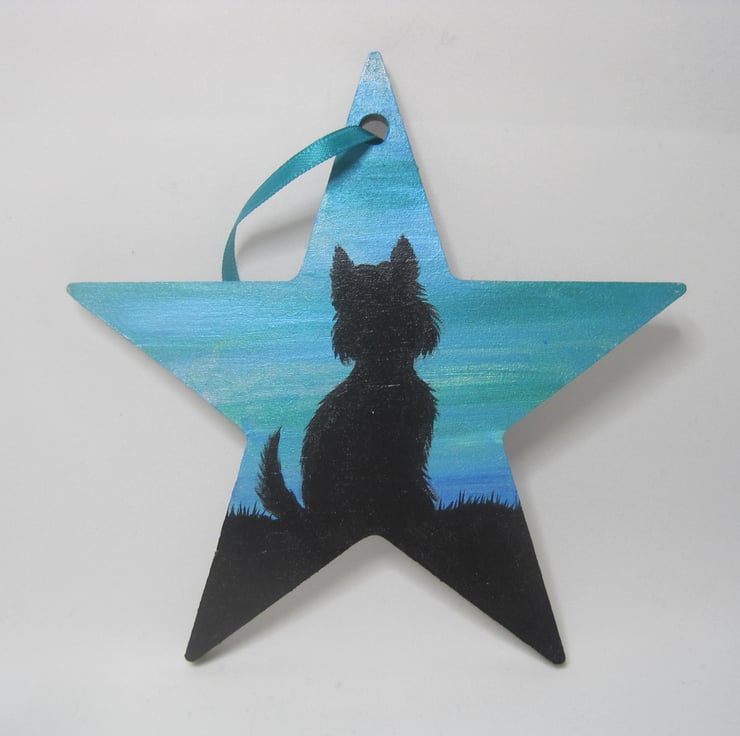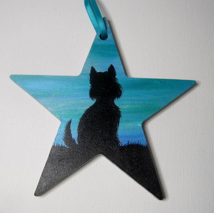 Key words: dog doggy puppy pup wetsie west highland terrier scottie scottish silhouette silhouetted painting picture star hanging decoration sky