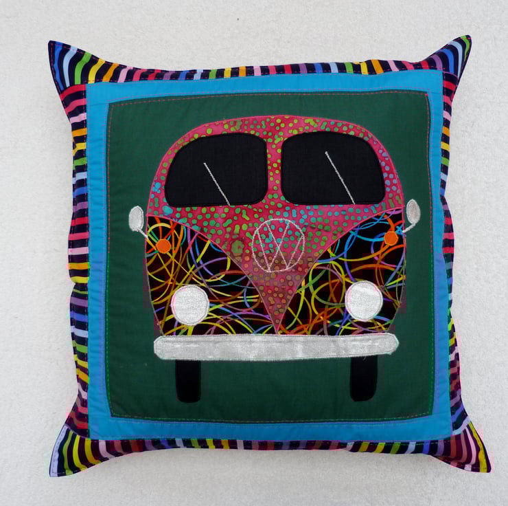 I have designed and created this funky VW camper van cushion cover from cotton and poly cotton fabrics.