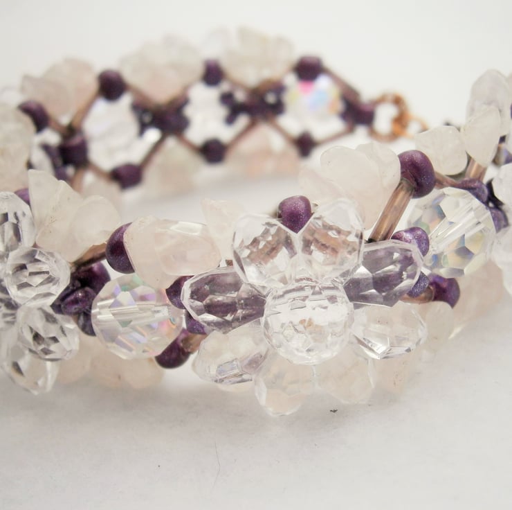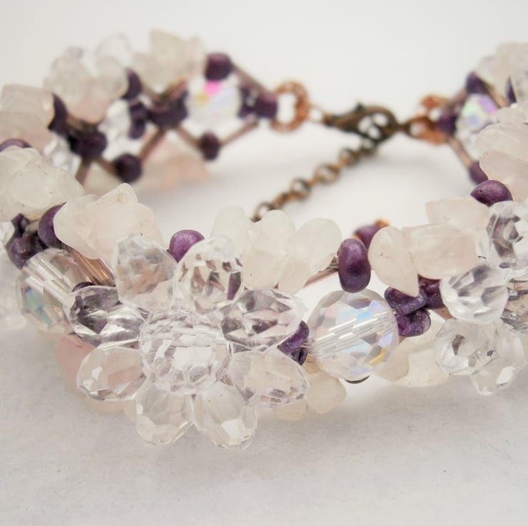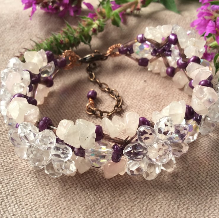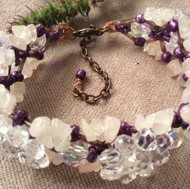 A beautiful chunky bracelet, adorned with semi-precious rose quartz chips, Czech glass faceted crystals, mauve/violet seed beads, bronze bugle beads, and crystal clear lucite flower beads. Woven together in a beautiful hugz and kisses weave, and fastened with a copper tone lobster clasp.