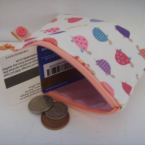 Cute little turtle coin purse with contrasting zip, ribbon and lining.