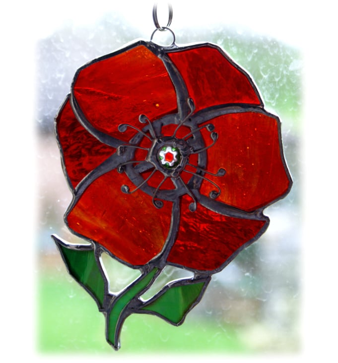 This is one of my favourite designs - a poppy - a stained glass suncatcher made using the Tiffany copper foil technique.