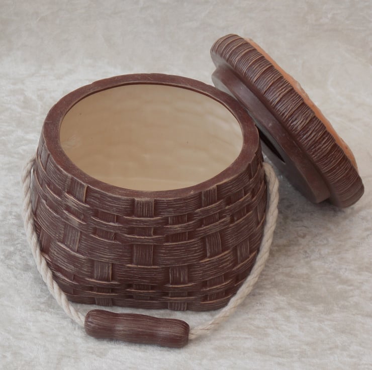 I have for sale a ceramic sewing basket, which was hand painted by myself. The main basket part is brown and peach in colour. The lid has an embroidered applique design on the top, in peach and white colours. Either side of the ceramic basket it has small holes, with a white cotton braided cord threaded through, with a small ceramic handle. This would make a lovely container for anyone into their sewing crafts, or perhaps given as a gift.