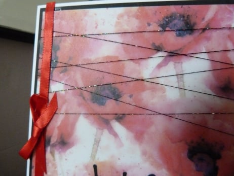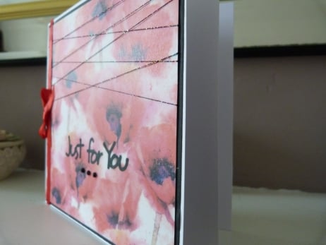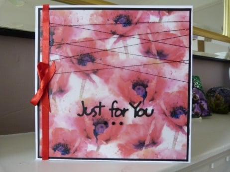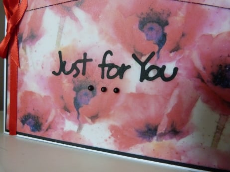 A beautiful vibrant vellum which has been printed with an array of red poppies, which has been mounted onto white card then onto black paper and then onto quality white card. Decorated with black irridescent thread, Just for You die cut from black paper, black rhinestones and finished off with red satin ribbon and bow.