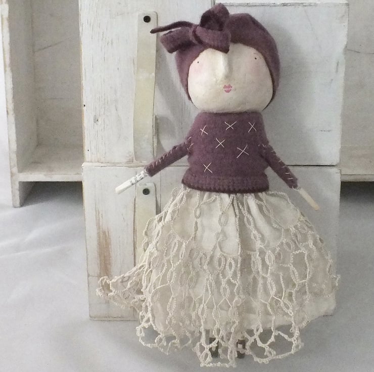 Her top and hat are made from boiled lambswool , randomly stitched to her torso ( dress making in a backwards fashion ) ! and her skirt is a vintage handmade lace doily with a linen petticoat underneath.