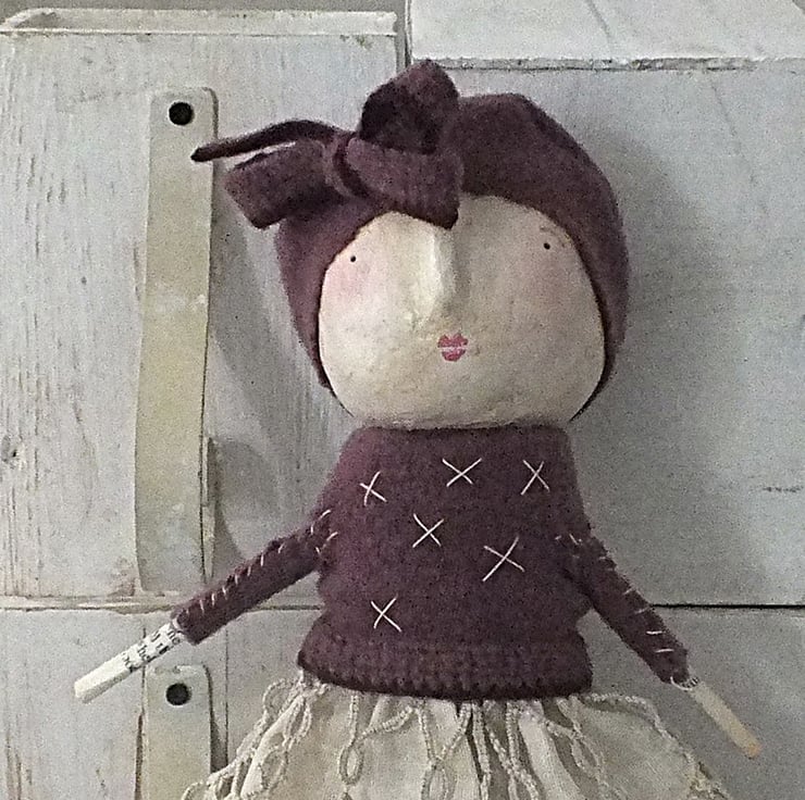 She has a papier mache body and limbs with an acrylic painted, paper clay head - all have been varnished.