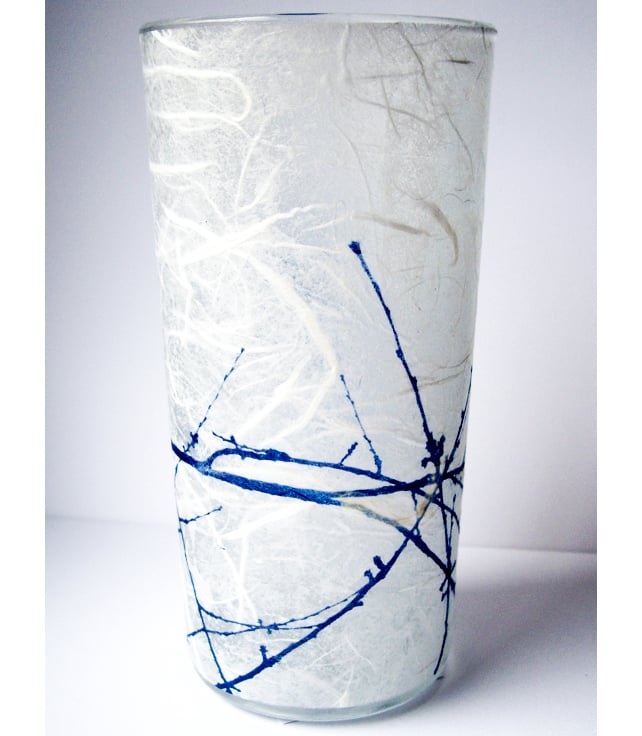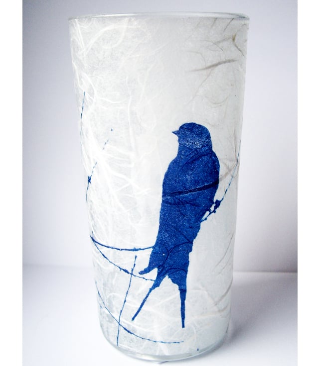 The lovely silhouette of a Swallow perching on a delicate branch makes this unique vase. Created using the cyanotype technique on mulberry paper then applied to glass. It is then varnished.