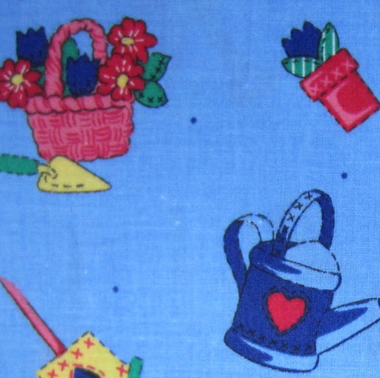 Lots of gardening items such as watering cans, trowels, plant pots and labels on a pretty blue background fat quarter.