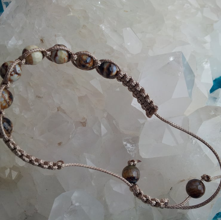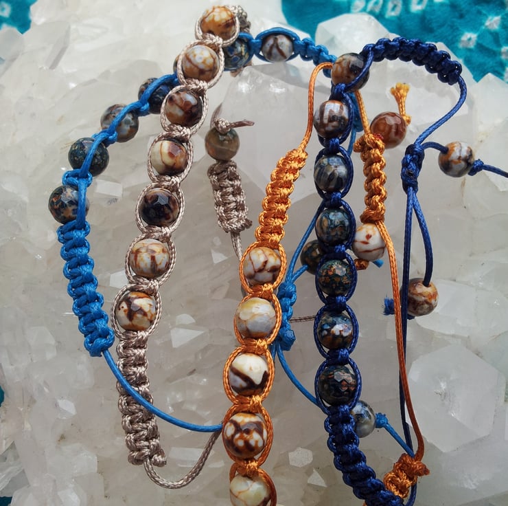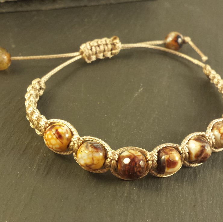 This is a fun bracelet, one of 4 made with the same stones but each with different coloured cord, they look great stacked together, suitable for everyone. The multi-coloured agates range through cream, taupe, browns and blues, they are 8mm in diameter. This bracelet is macramed with taupe cord, and contains a total of 9 beads, including the cord end beads. The fastening is knotted sliding style, easy to use. It goes from 10 inches down to 5 inches at it's tightest. I love making this type of bracelet and have a number listed, if you have a special request of colour/stone combination, do contact me for a quote.