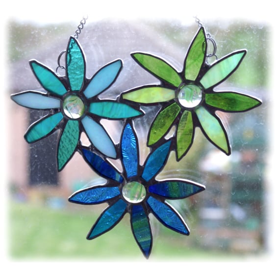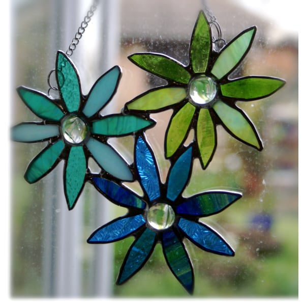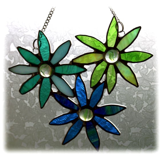 I've made a bunch of flowers. These are daisies, turquoise - green and blue shades and lime green. Each has a striped green nugget at the centre. I've used 3 shades of glass in each flower, in different textures to give plenty of movement.