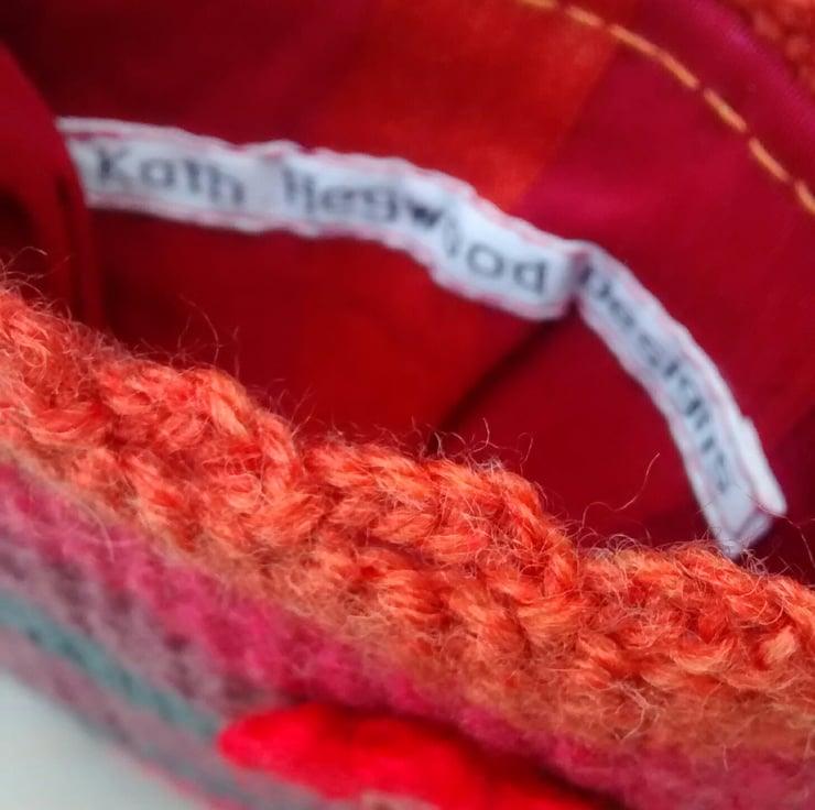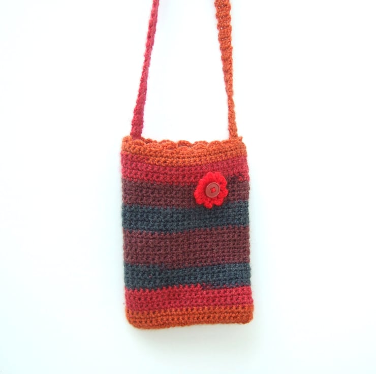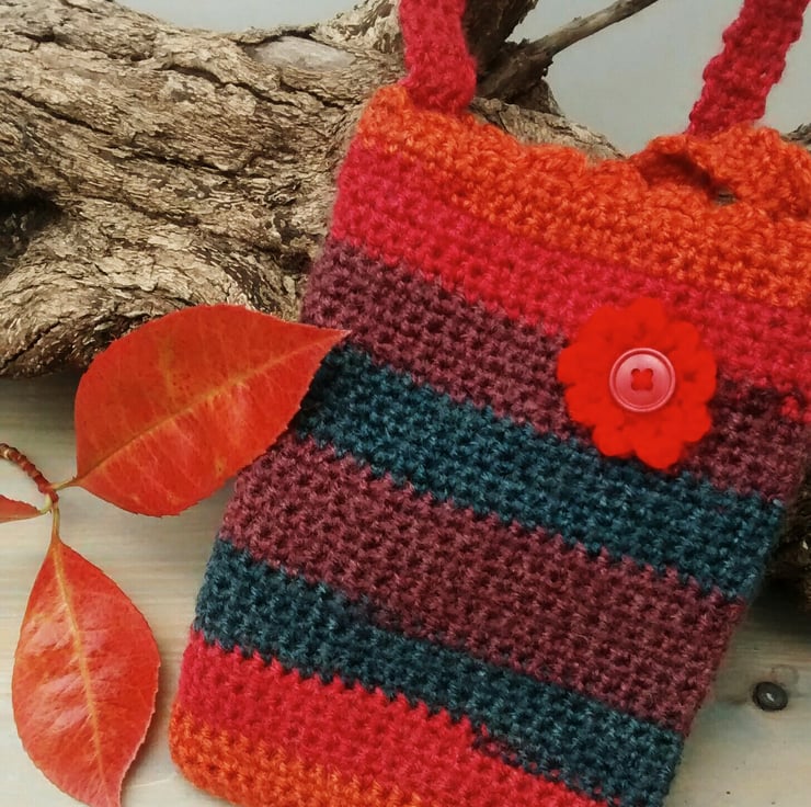 This pretty bag is my own design. Handmade using a stripy wool blend in a lovely mix of colours. A crochet flower has been stitched on to the bag for added cuteness. An upcycled button has been sewn to the flower centre.