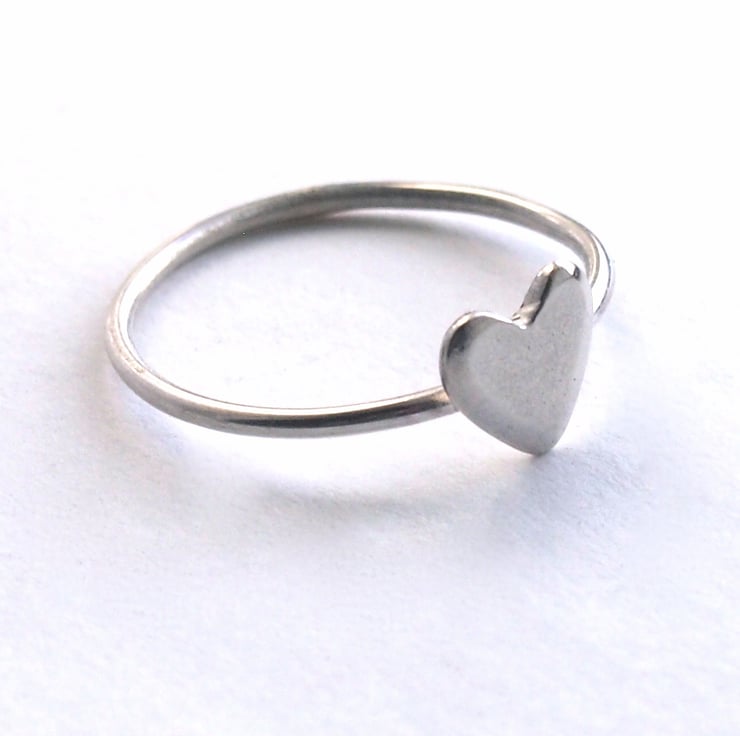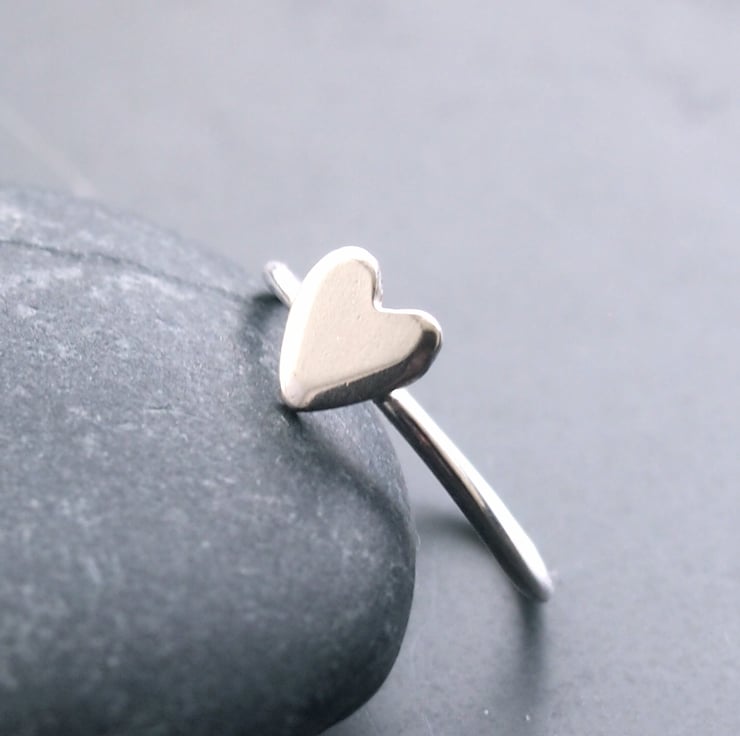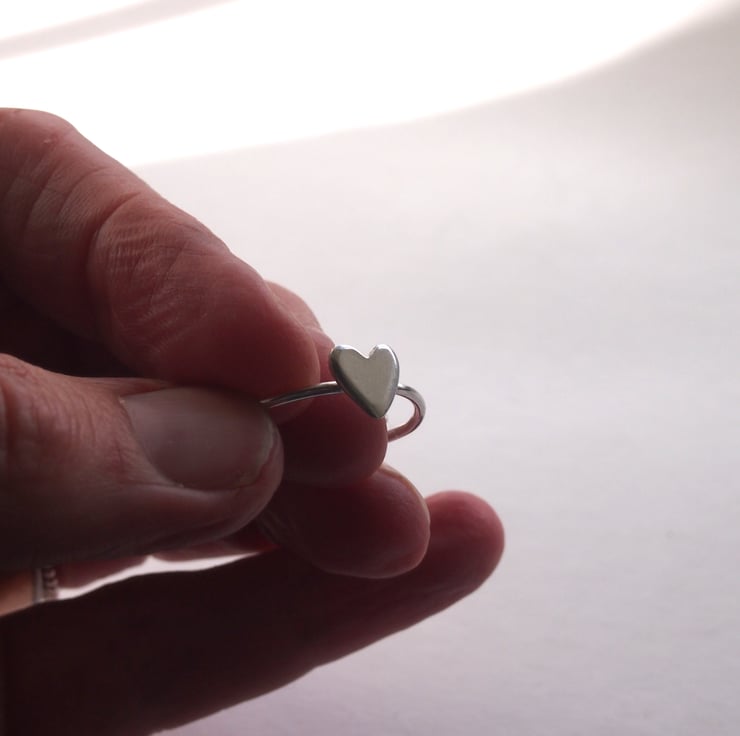 One of our own little hearts on a 1.5mm sterling silver ring ready to stack or wear alone .