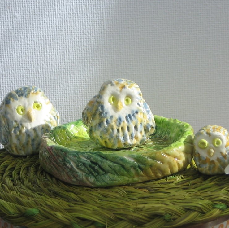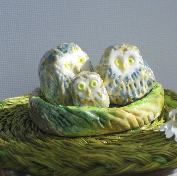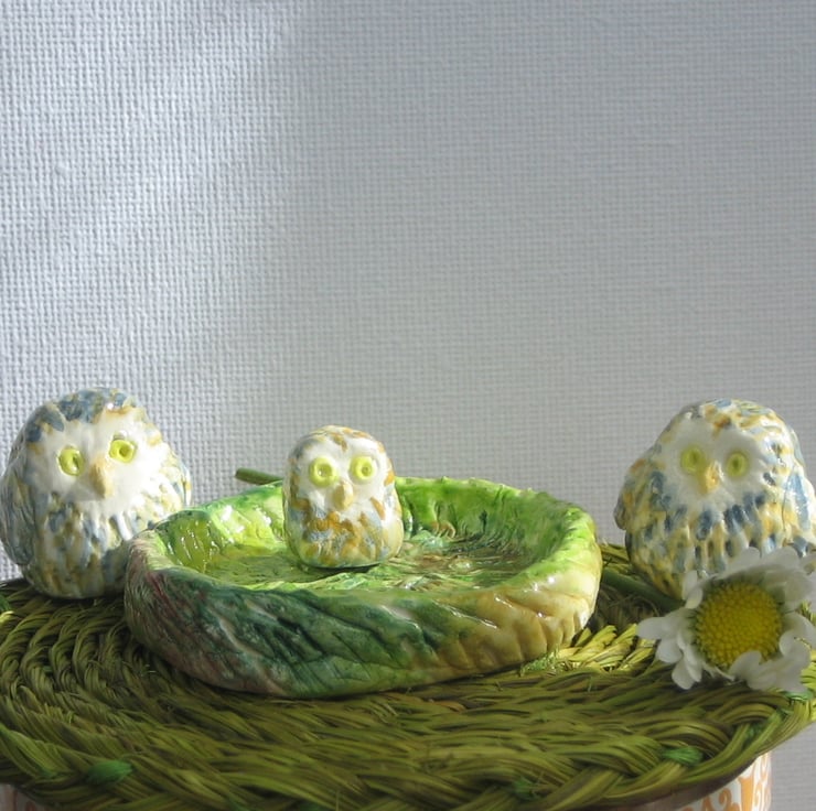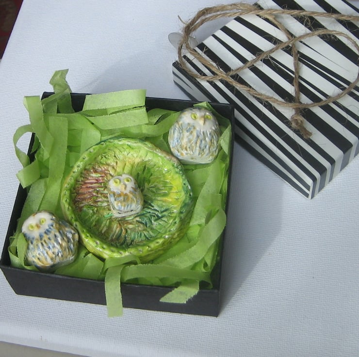 Were £14, now only £7. Three sweet little baby owl in their own nest! Modelled in air-dry clay then painted in watercolour and finished with a coat of varnish. The tallest owl is just under 2.5 cm and the smallest 1.5cm. The nest is 5cm across. Delivered in an attractive gift box. A quirky gift for a man or woman for a birthday or any other special occasion.