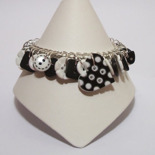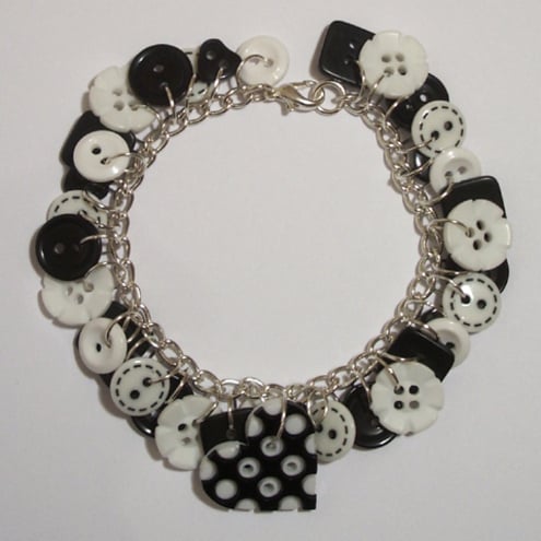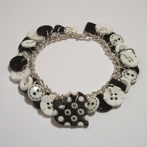 This distinctive button bracelet rich with an assortment of black and white buttons, features one large black and white heart button.