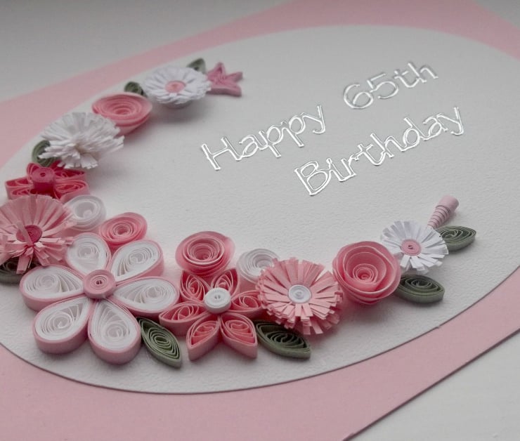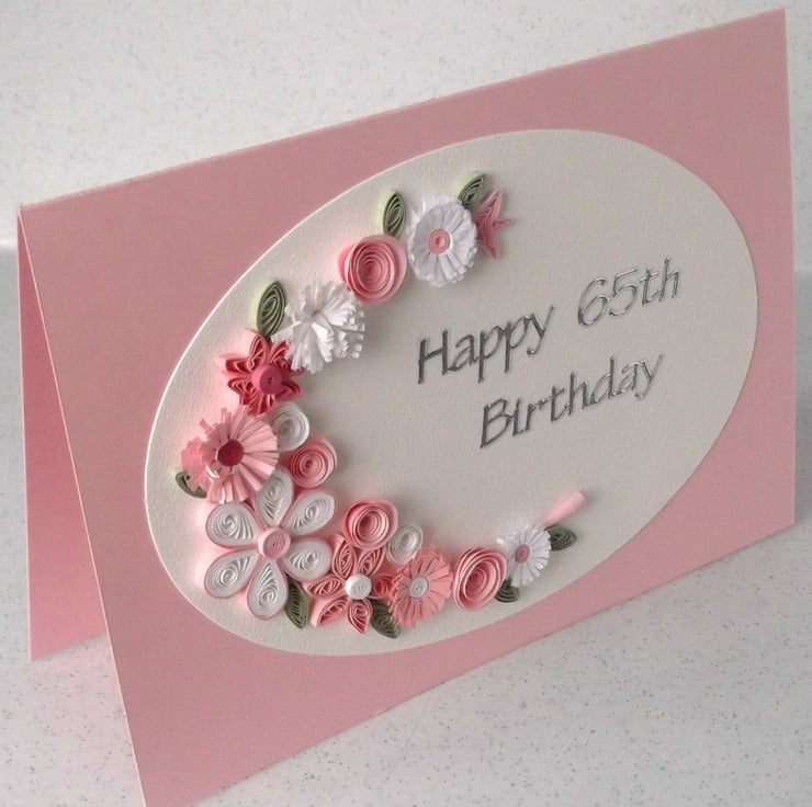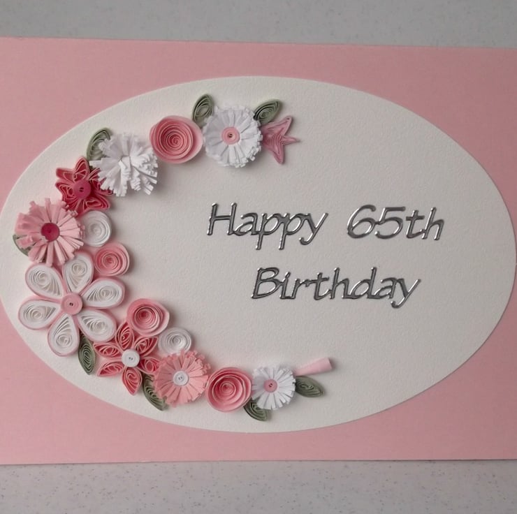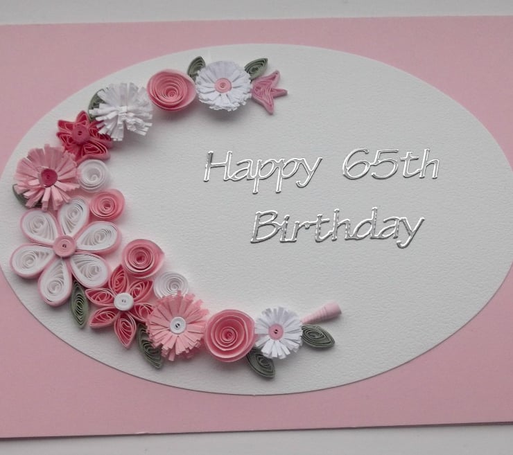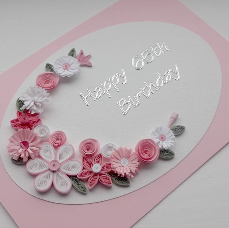 All the quilling on this card is handmade by me! Each petal, bloom and leaf is handrolled from strips of coloured paper. An arrangement of quilled daisies and foliage surrounds an oval scalloped panel, which reads Happy 65th Birthday or can be personalised with any message you need. The result is a beautiful original card which makes a great keepsake for the future.