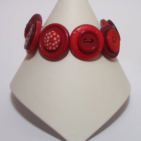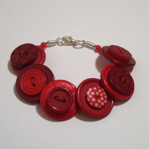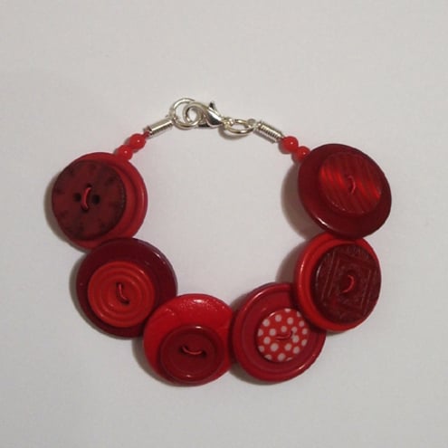 This distinctive button bracelet is rich with an assortment of red buttons. These are threaded onto jewellery wire, which secures at the end with a silver plated lobster clasp fastener.