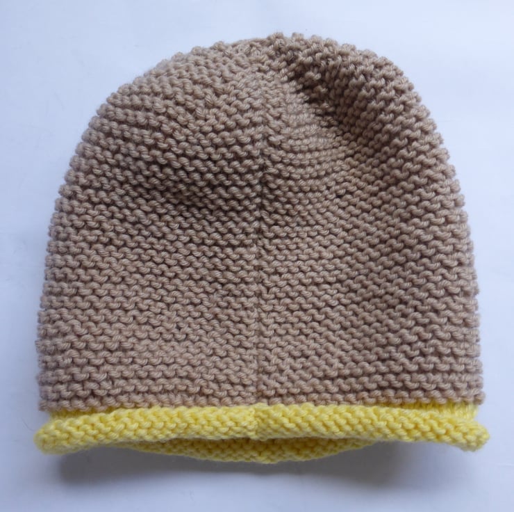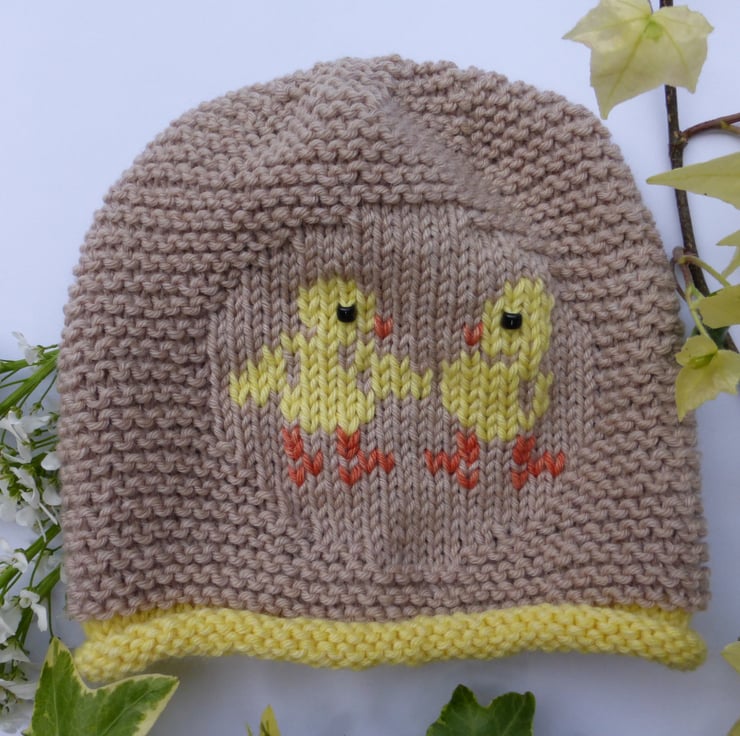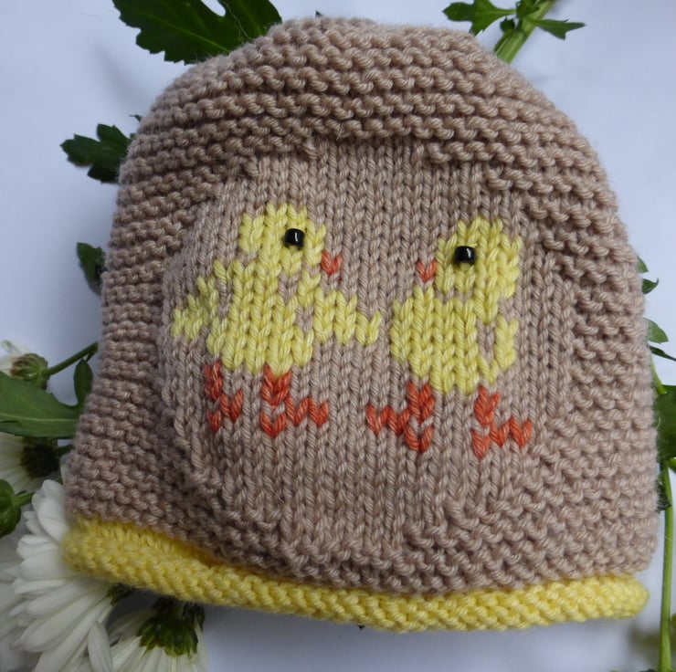 This is a detailed written KNITTING PATTERN in pdf format for a cute baby chick themed hat. The hat has a roll brim and a garter stitch body with a stocking stitch 'circle' for the chicks motif. The chicks are added using duplicate stitch once the hat has been knit, however they could be added as you knit using the intarsia method. Beads are used for the eyes, but you could add eyes using duplicate stitch if you prefer. The hat is knit flat on two needles with a seam at the back.