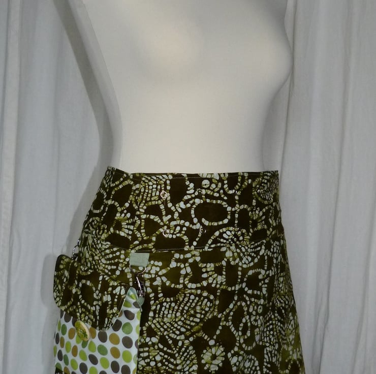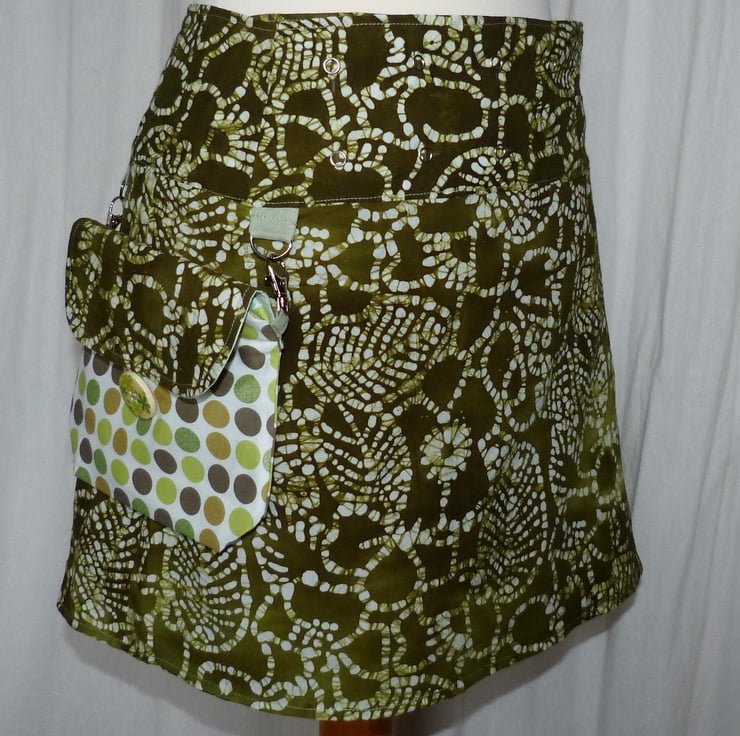 I have designed and created this fully adjustable wrap skirt to wear over leggings. It is adjustable from a 28" to a 40" waist. There are 7 popper positions and any number of press studs can be fastened to create a look and fit that you want. The skirt measures 16" from top of the waistband to the hem. and is tailored and shaped with waist darts to give a perfect fit. The skirt has french seams and turned edges so there are no raw seams.