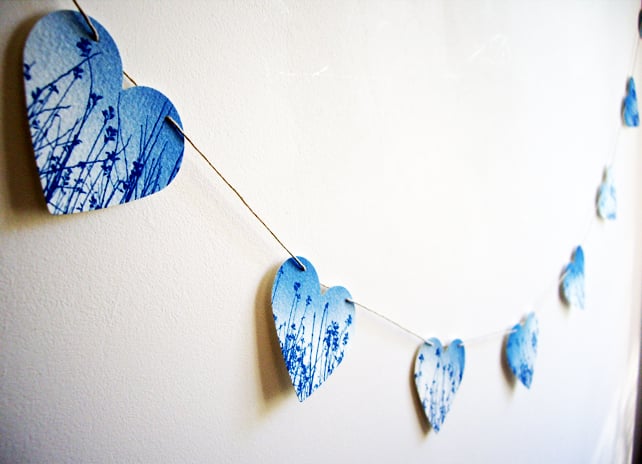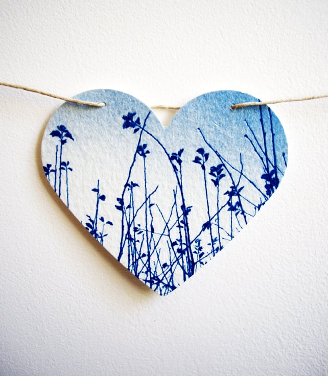 Ten large hearts with cyanotype meadow images strung on 2m of hemp thread make this lovely Spring/ Summertime bunting.