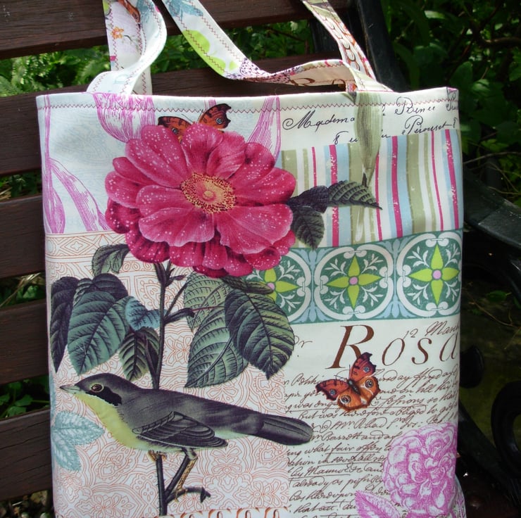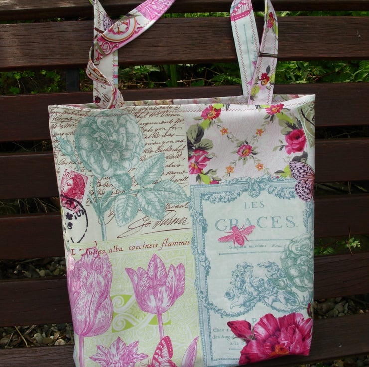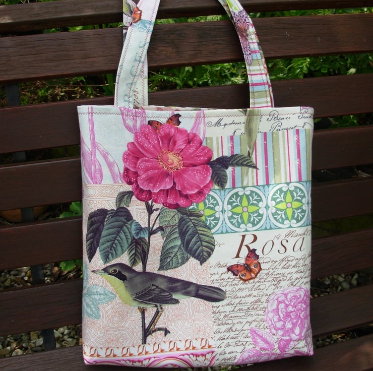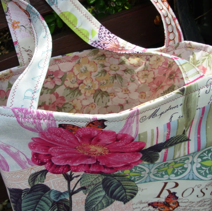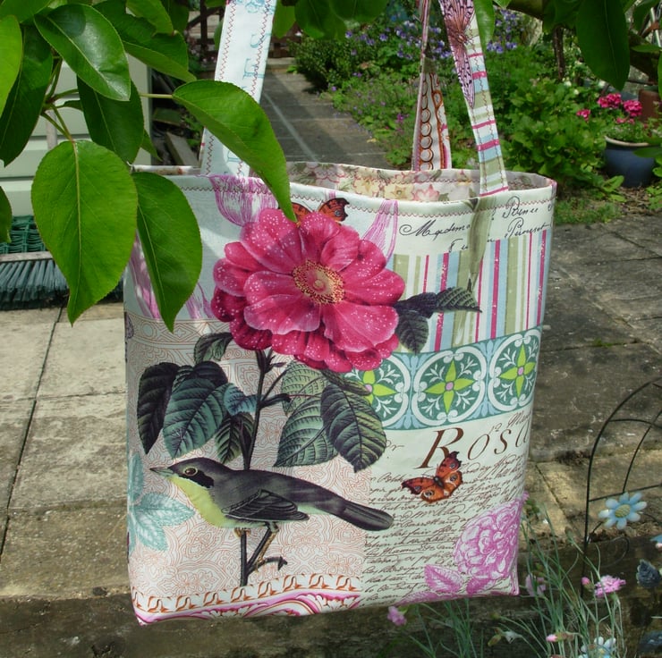 I've made this pretty shopping / tote bag in the 'French Journal' range of cotton fabric, with flowers, leaves, birds and script.