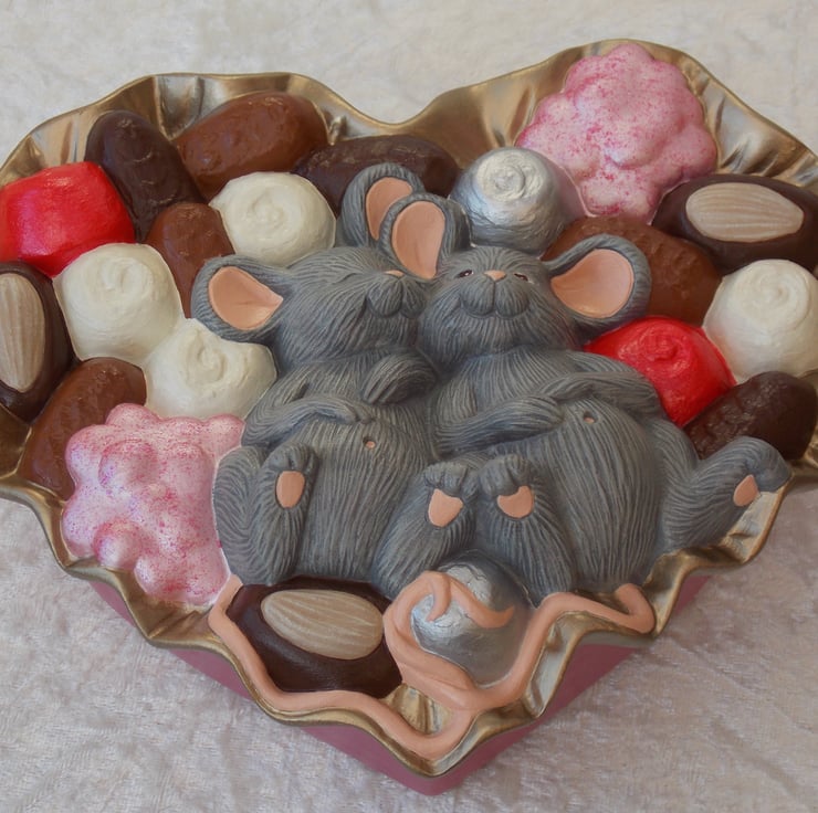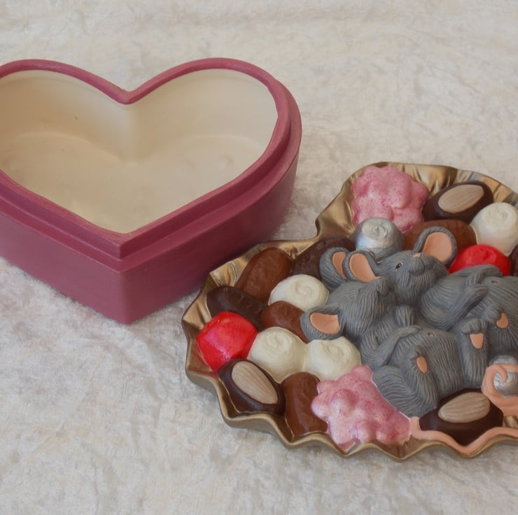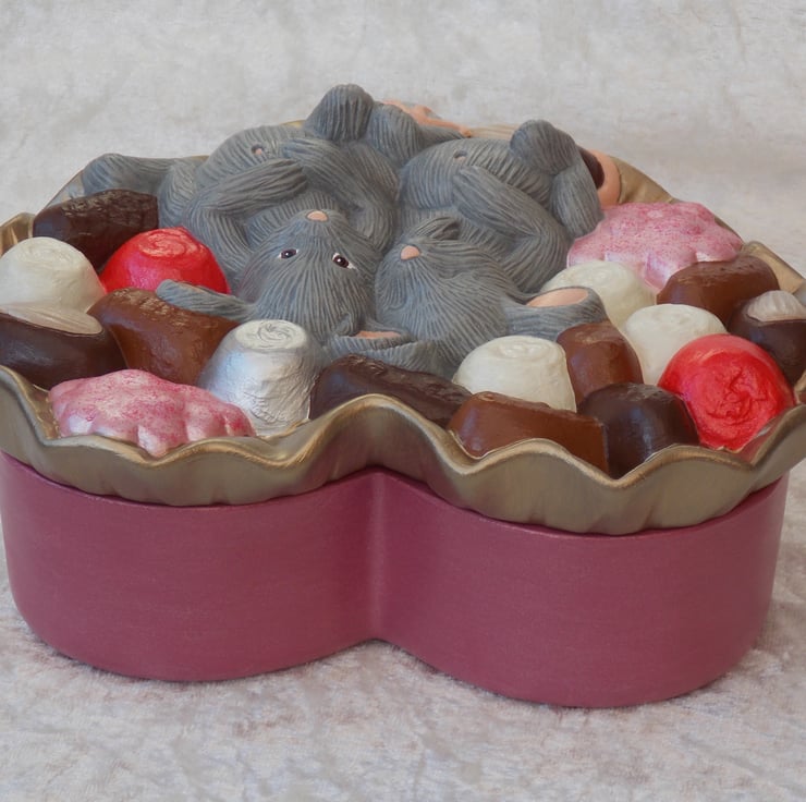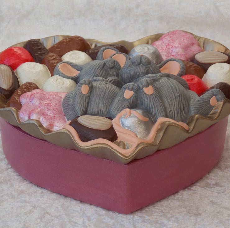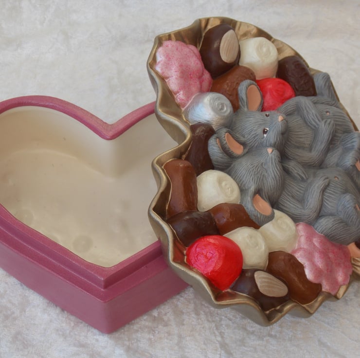 I have for sale a novelty ceramic jewellery/trinket/gift box, which was hand painted by myself. It is a heart shape, the bottom half is pink in colour, which would hold your items. The top half or lid, looks like a luxury box of assorted chocolates, but lying in the middle asleep are two grey mice! This would make a lovely addition in anyone's home, or perhaps given as a gift.