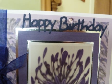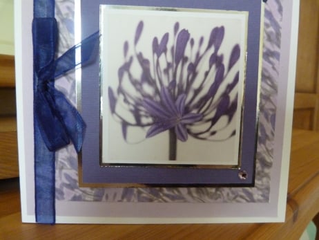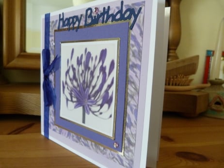 A beautiful image of a blue agapanthus printed onto vellum. Mounted onto silver mirri card, purple card, printed paper, lilac paper then onto quality white card. Happy Birthday die cut from navy blue card, embellished with lilac rhinestones and finished off with navy blue organza ribbon and bow.