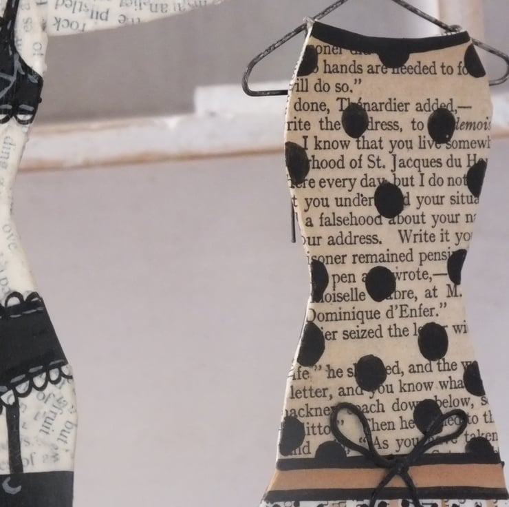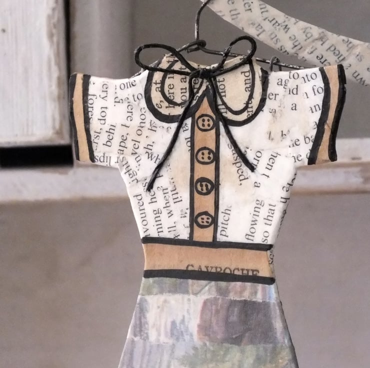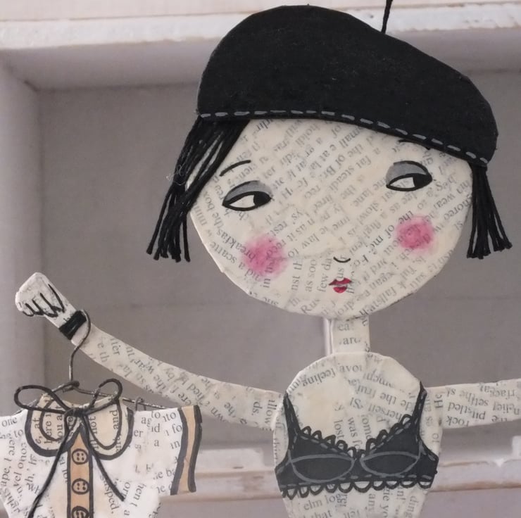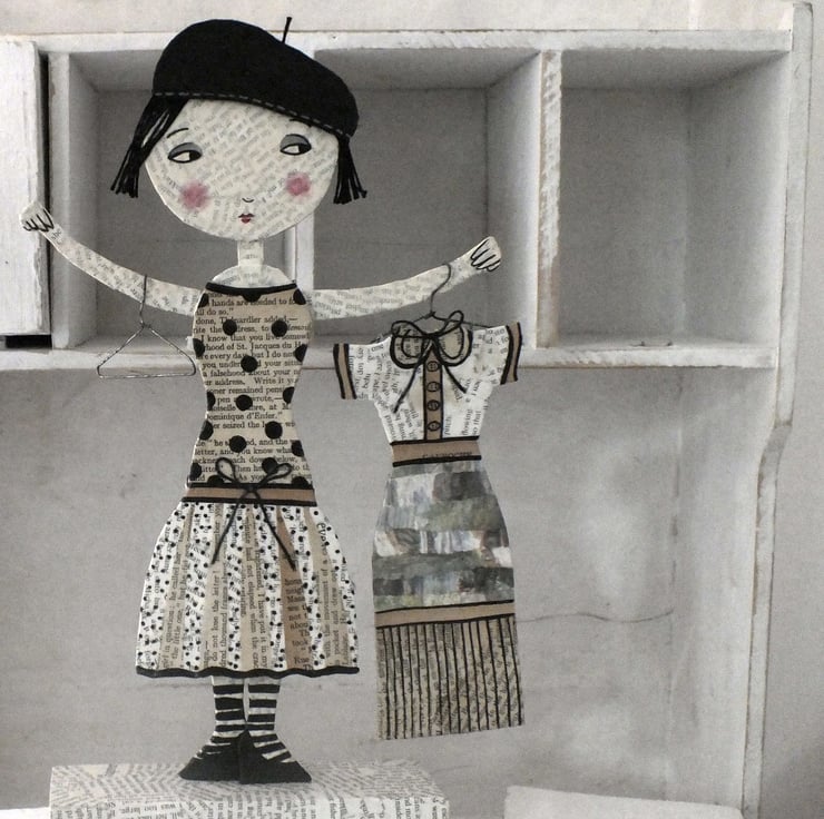 The dresses are a mix of book papers and acrylic paint. The dresses and the beret have wire attached to the reverse and can both hang on the little wire coat hangers that i have made (main image) or she can wear one of the dresses. The reverse is painted black.