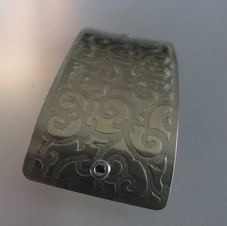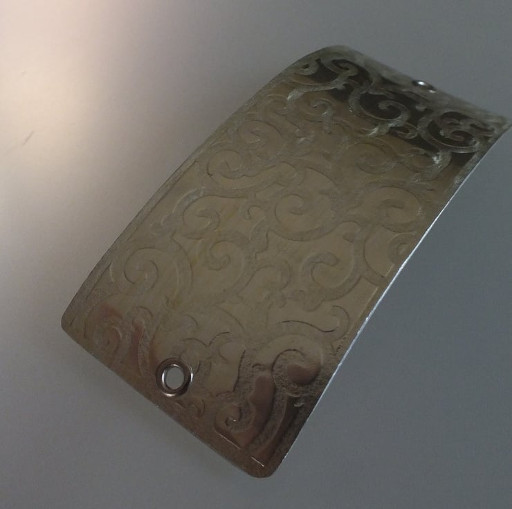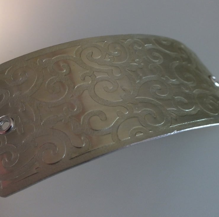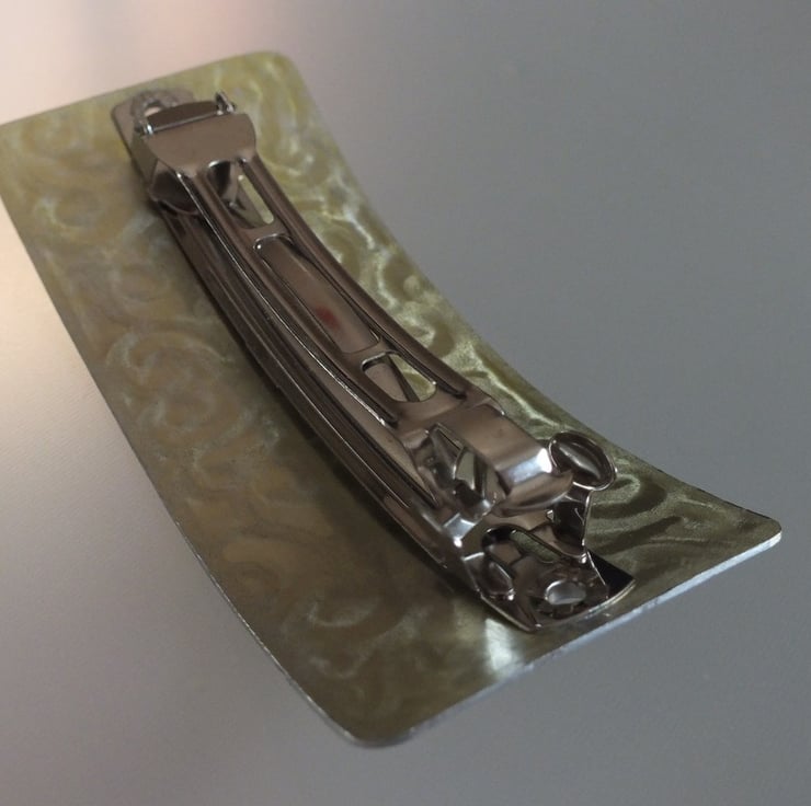 Barrette hair clip/slide made from textured aluminium, hand painted in light green colour. Very light weight, and comfortable to wear. Approximately 8 x 3.8 cm