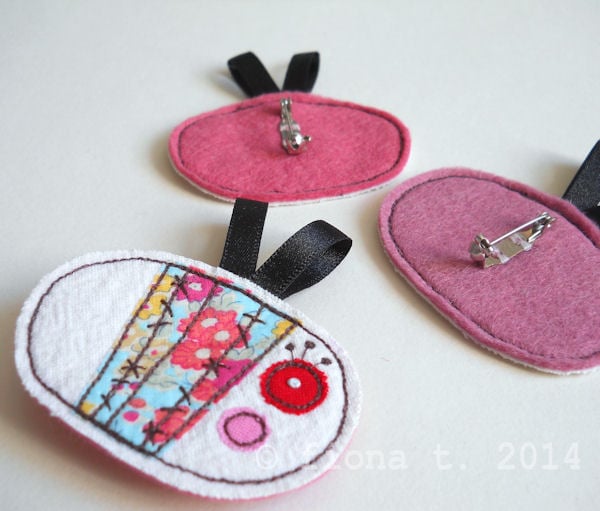 they are made from heavy weight calico, and backed with felt. the brooch clip is securely sewn by hand.