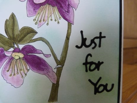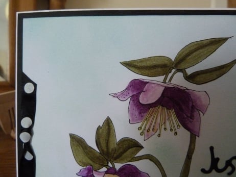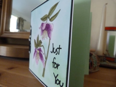 A pen and ink drawing of a hellebore, water colour painted onto white card. The background graduates from blue down to green. Mounted onto black paper then onto quality white card. Finished off with black/white spotted ribbon bow and the words Just For You die cut from black paper.
