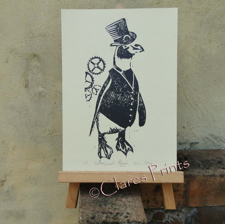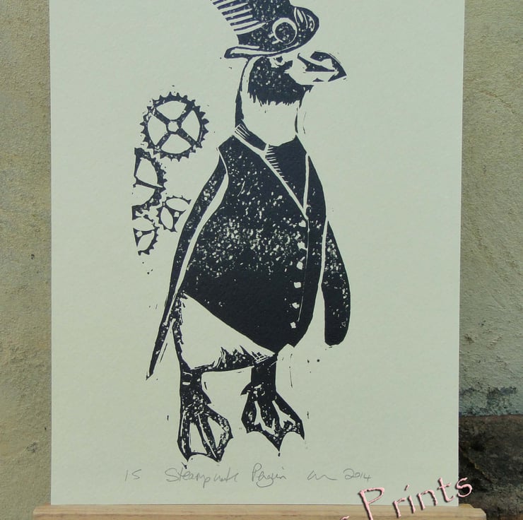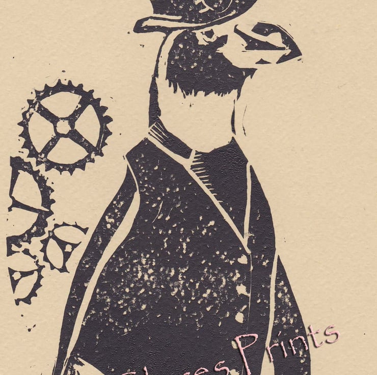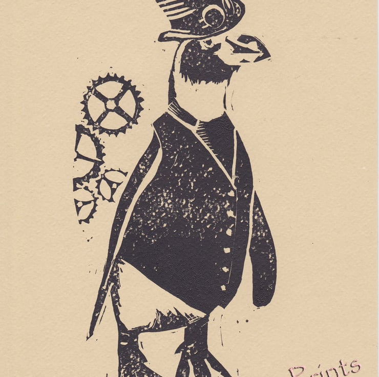 Keywords: Steampunk Penguin Art Linocut Lino Print Printmaking animal bird retro black and white top hat goggles cogs