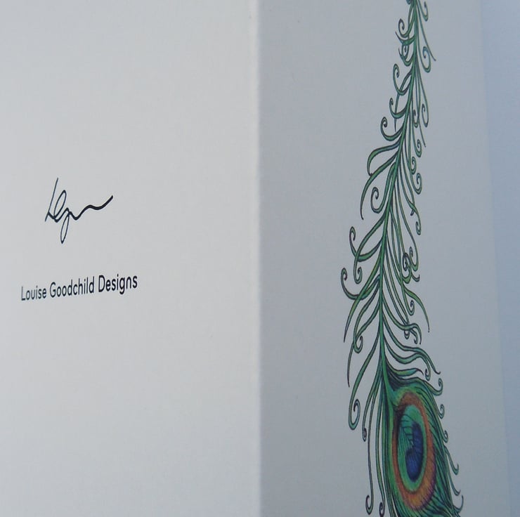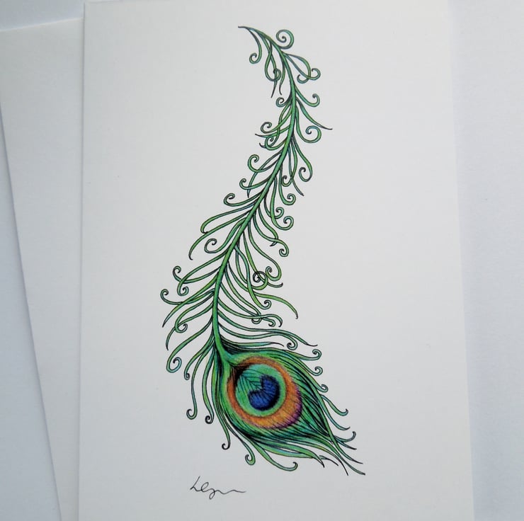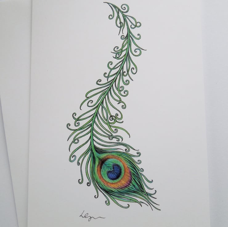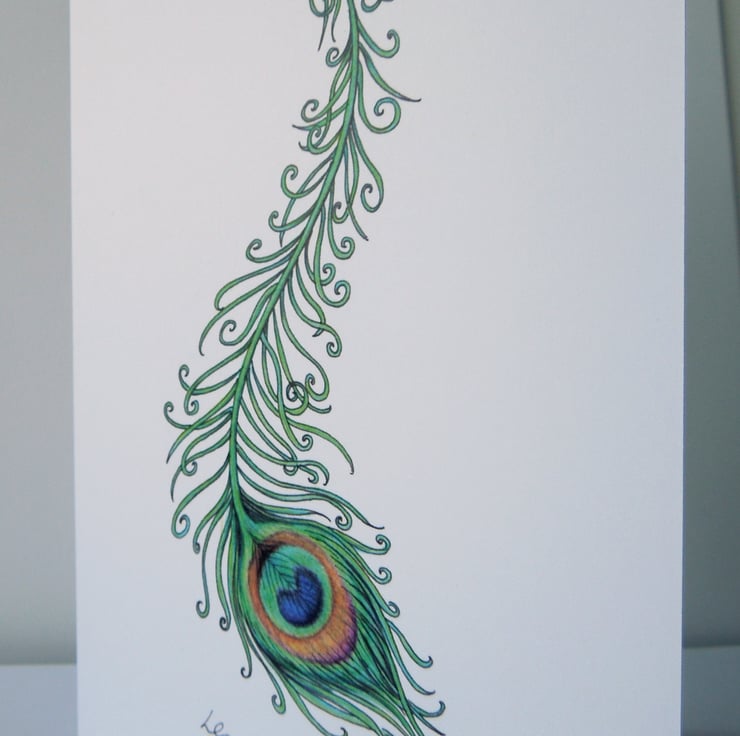 Peacock Feather greeting card, featuring a print of one of my original pencil and ink drawings.