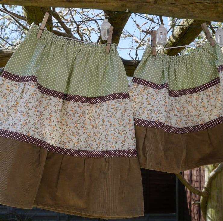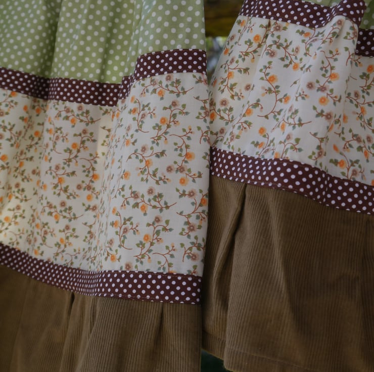 The waist band is elasticated along the top of the sage green spotty cotton top layer. Next comes a lovely floral cotton which came from a vintage Marks and Spencer bed linen set! and the bottom is a fine cord. the weight of this pulling the skirt down nicely yo give a good finish to the skirt.