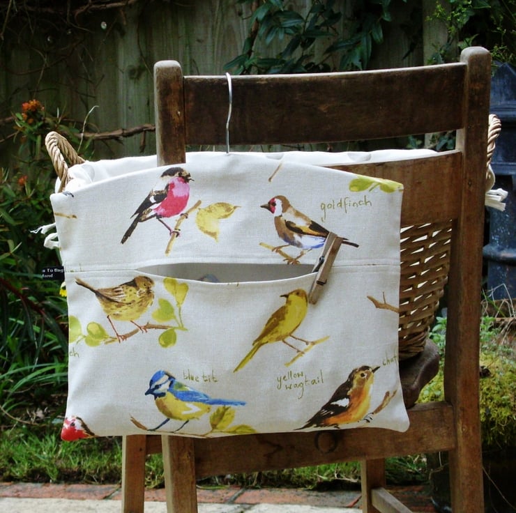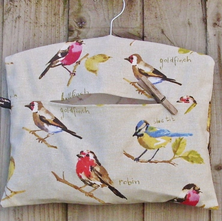 A cotton peg bag with a common garden bird design on a cream background. The birds featured are Yellow Wagtail, Bullfinch, Blue Tit, Goldfinch, Chaffinch, Greenfinch and Robin. The peg bag is approximately 34cm wide and 28cm long with a wooden hanger in the top and can hold 75-100 wooden pegs.