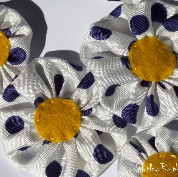 White and navy satin with a curry yellow centre in wool felt, and a satin navy ribbon. The ribbon fastens on one side with lobster clasp to make it easier to put on and take off.