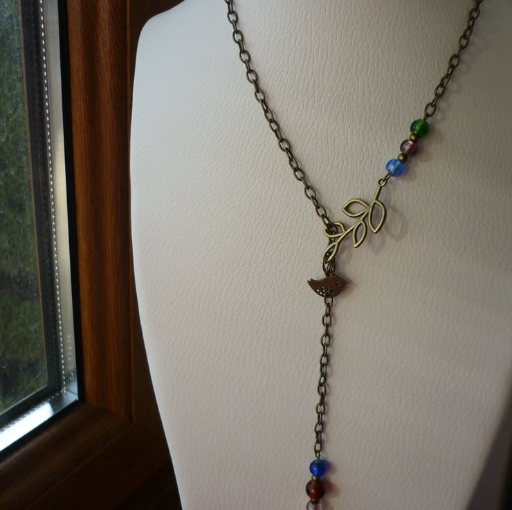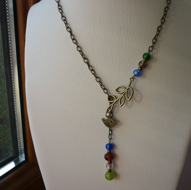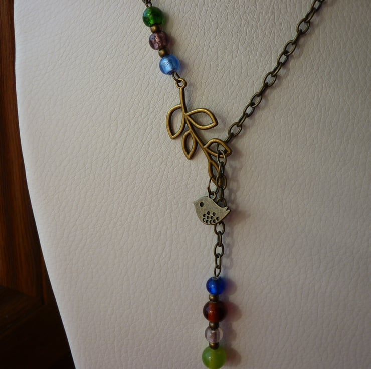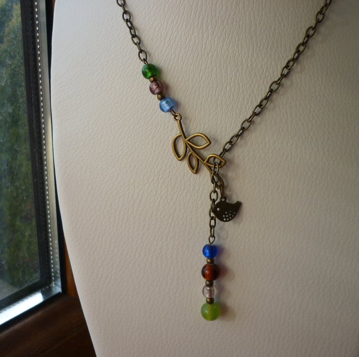 THE NECKLACE HAS BEEN MADE WITH A SELECTION OF SILVER LINED GLASS BEADS, ANTIQUE BRONZE FIVE LEAF NECKLACE CONNECTOR, A SMALL ANTIQUE BRONZE CUTE LITTLE BIRD CHARM, ANTIQUE BRONZE TRACE CHAIN AND FINISHED WITH ANTIQUE BRONZE LOBSTER CLASP AND FINDINGS.