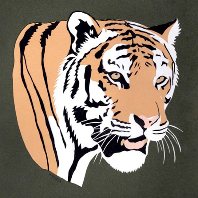 This is a unique original hand cut paper design of a magnificent tiger head. His attention is focussed out of the picture to the right, as he keeps an ever watchful eye on something just out of our sight. His fearsome mouth is open to show his pink tongue. By limiting the design to just 5 colours of card on a dark contrasting background the picture is simplified to the essential shapes and outlines, creating an almost graphical image.