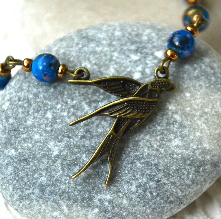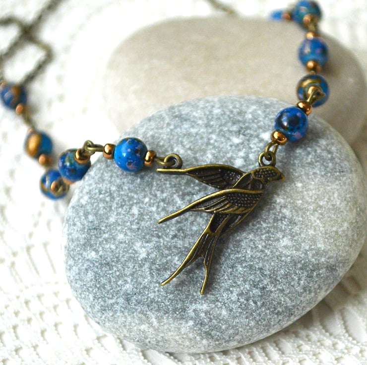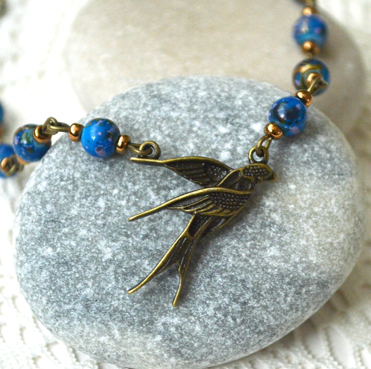 A beautiful, vintage-inspired necklace with a Swallow charm and marbled blue beads on antique-bronze findings.